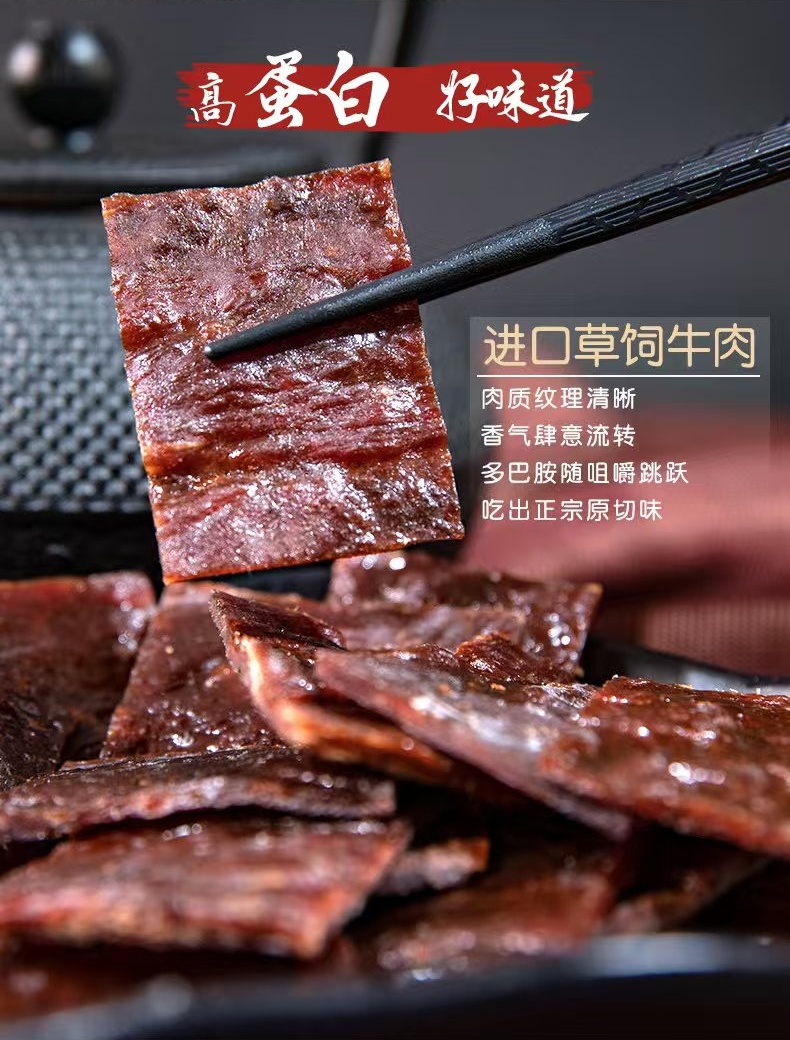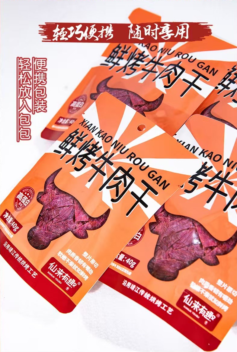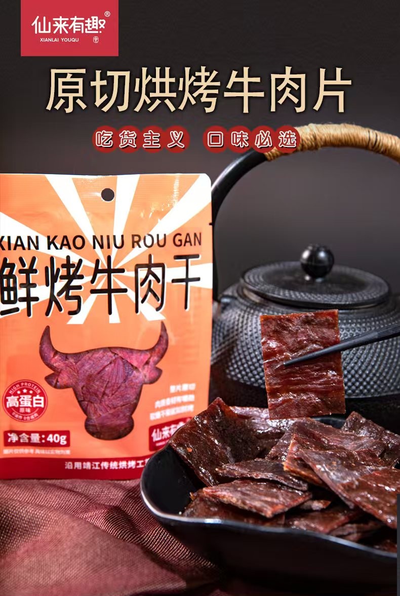 仙来有趣鲜烤牛肉干,选用进口草饲牛肉,精选整块牛后腿肉,手工修整筋膜和脂肪,整片原切,肉质纹理清晰。低温慢烤,特添鱼露调味,口味鲜甜,回味无穷。小袋包装方便随时补充高蛋白。