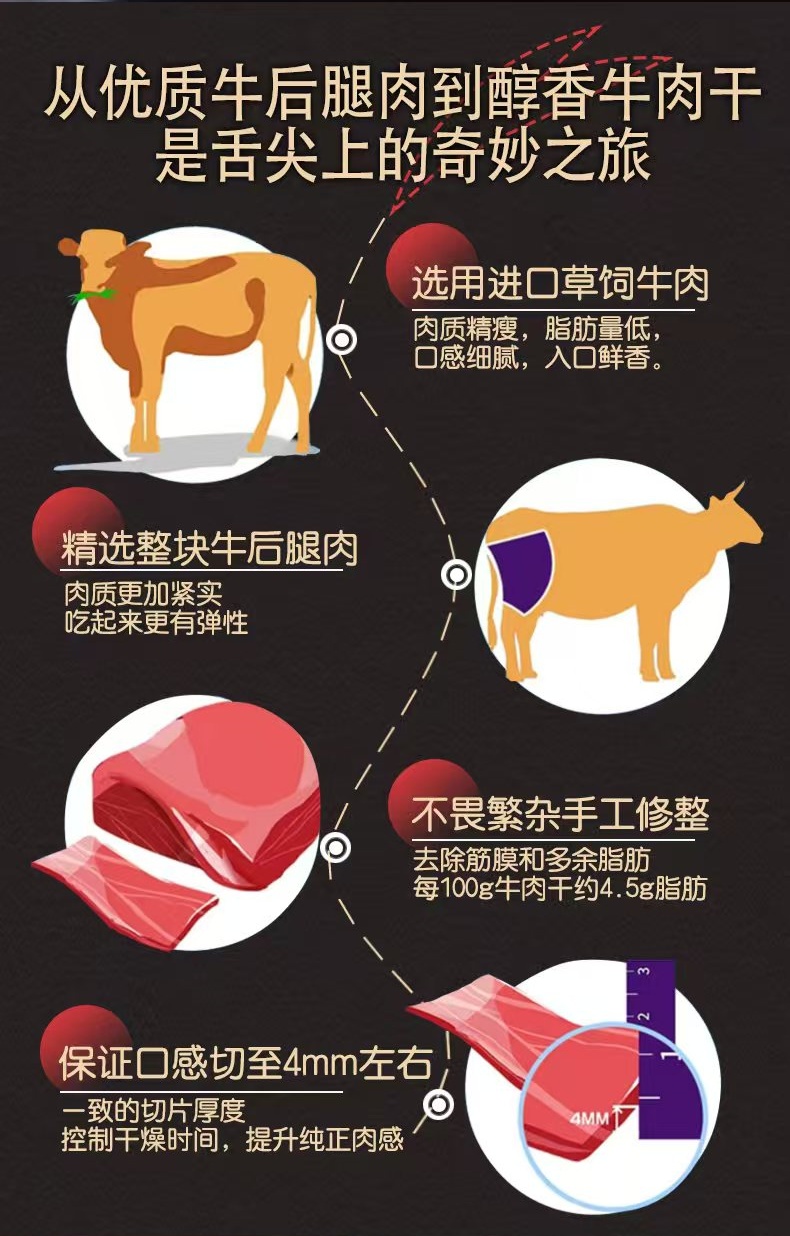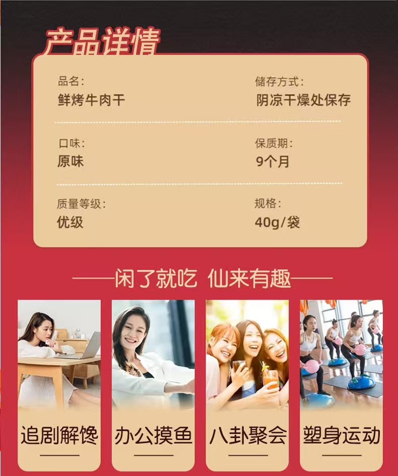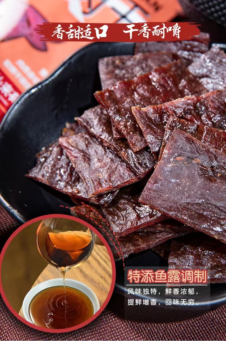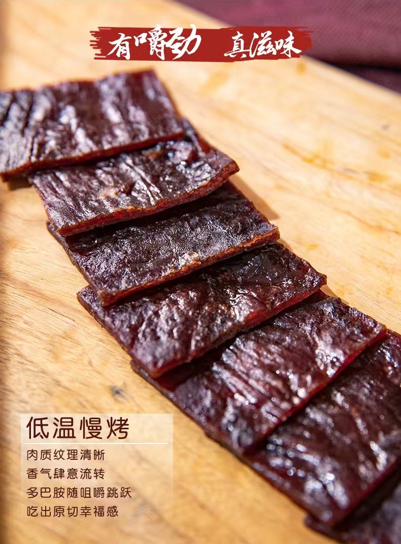 仙来有趣鲜烤牛肉干,选用进口草饲牛肉,精选整块牛后腿肉,手工修整筋膜和脂肪,整片原切,肉质纹理清晰。低温慢烤,特添鱼露调味,口味鲜甜,回味无穷。小袋包装方便随时补充高蛋白。
