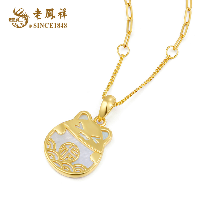 老凤祥S925银镶嵌天然贝母Q萌招财猫趣