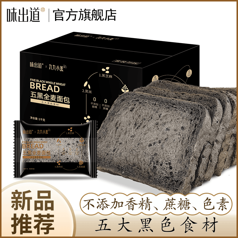 味出道 五黑全麦面包1000g整箱营养无糖精粗粮代餐饱腹早餐吐司片