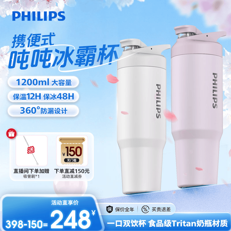 【情侣款】飞利浦便携吸管冰霸杯大容量运动车载野外保冰神器保温杯