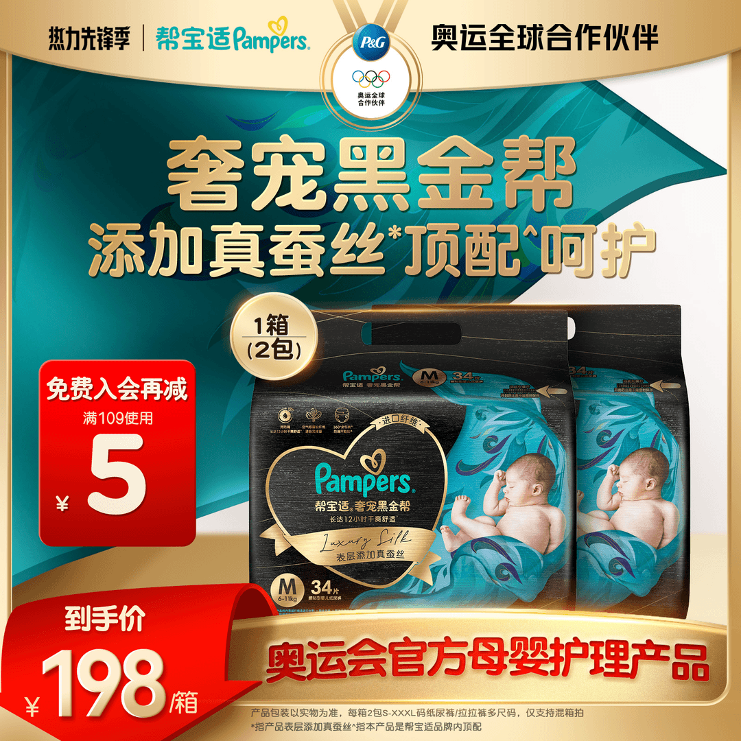 【爆卖5折】帮宝适黑金帮蚕丝超薄亲肤透气纸尿裤尿不湿拉拉裤S-3XL
